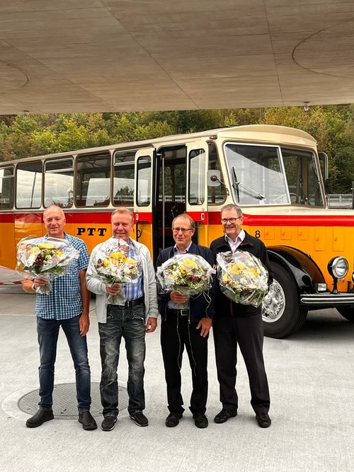 Die Chauffeure Peter Amsler (v. l.), Andreas Volpi, Willi Schaffner und der Geschäftsführer des Postauto-Betriebs Reto Huber, feiern dieses Jahr ihr Berufsjubiläum.